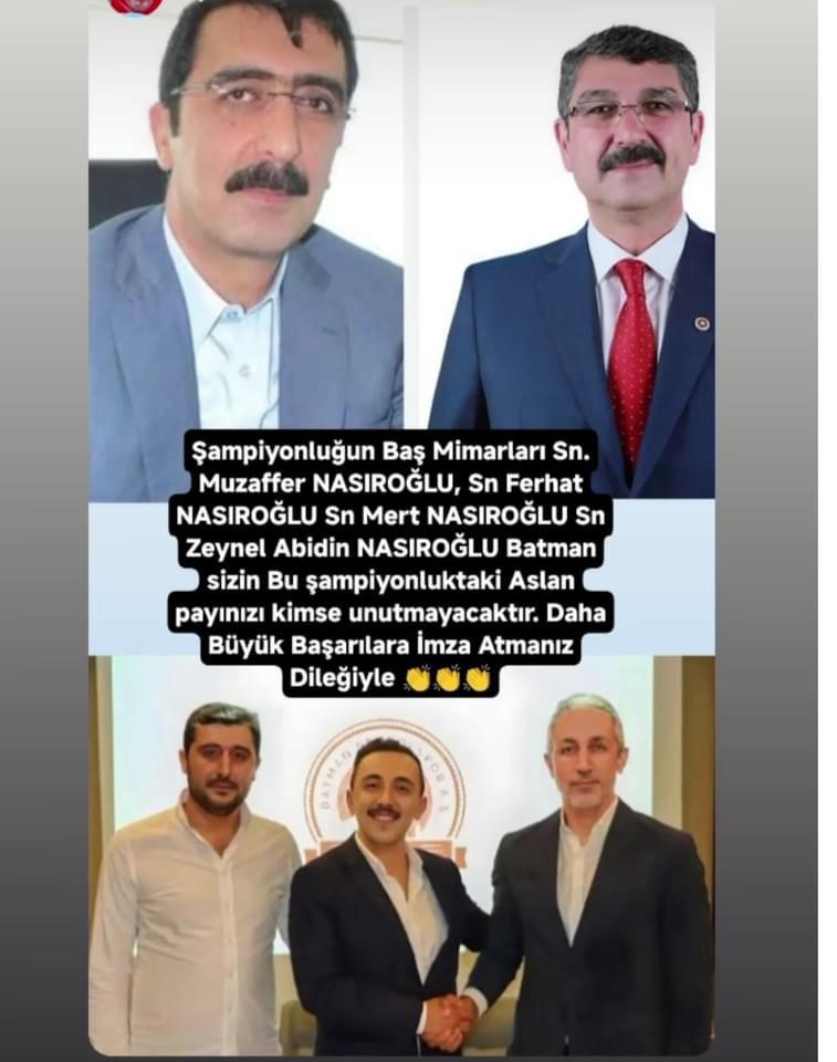 Bu başarının arkasındaki en önemli aktörlerden biri ise hiç kuşkusuz Batman’ın köklü ailelerinden Nasıroğlu ailesi. Fernas Holding Yönetim Kurulu Başkanı Muzaffer Nasıroğlu, AK Parti Batman Milletvekili Ferhat Nasıroğlu ve Petrolspor Derneği Başkanı Zeynel Abidin Nasıroğlu’nun kulübe verdikleri destek, Batman Petrolspor’un yeniden yapılanmasında belirleyici rol oynadı.