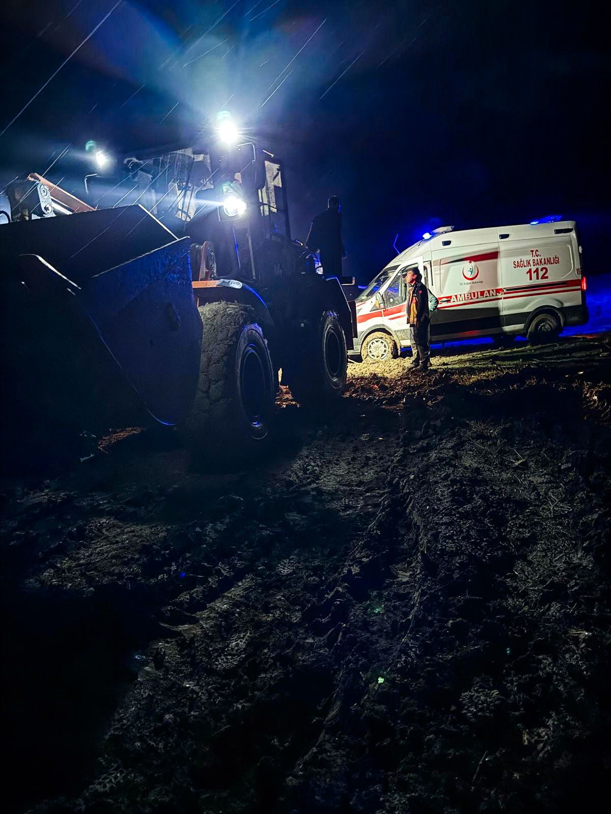 Bölgeye sevk edilen iş makineleri, kısa sürede olay yerine ulaştı. Ekiplerin yoğun çalışması sonucu ambulans çamurdan çıkarılarak yol yeniden trafiğe açıldı.