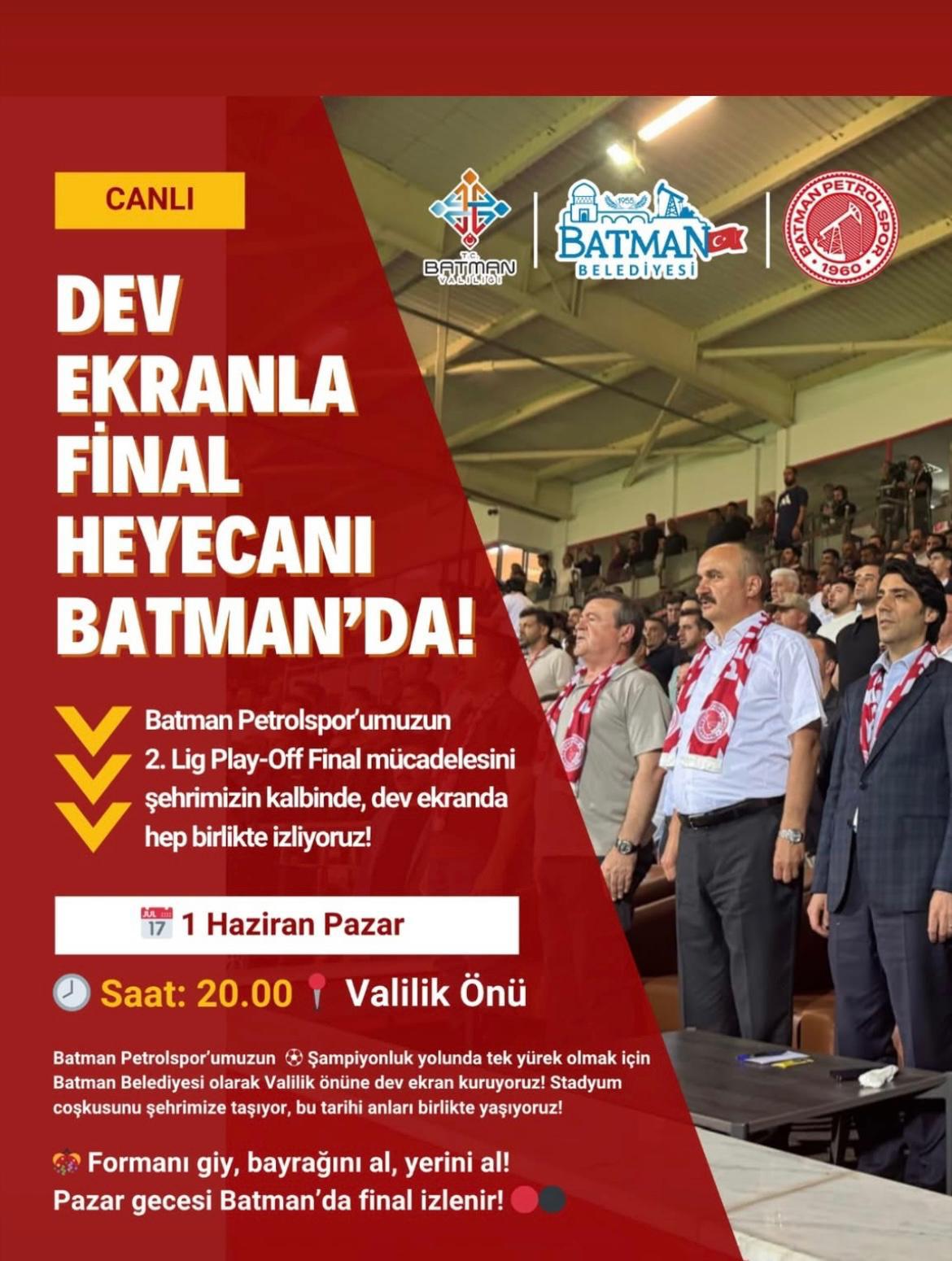 Batman Petrolspor’umuzun 2. Lig Play-Off Final mücadelesini şehrimizin kalbinde, dev ekranda hep birlikte izliyoruz!