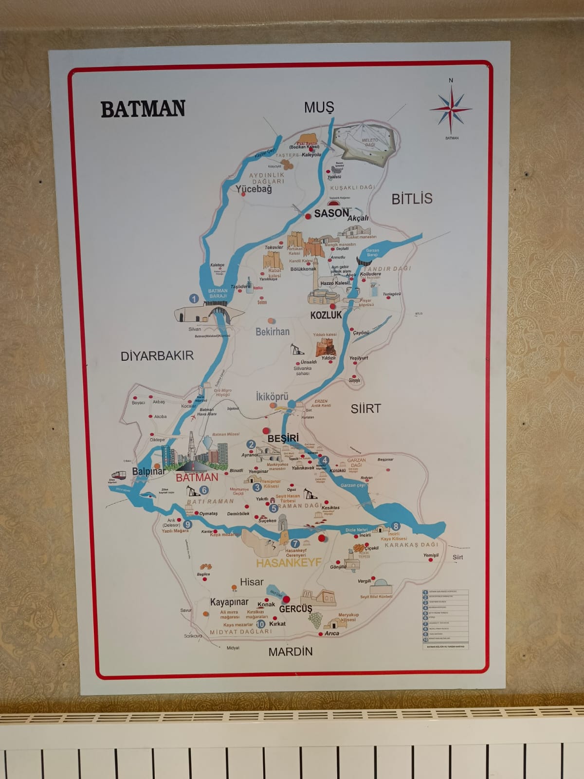 Haritada Hasankeyf’in tarihi dokusundan Sason’un doğal güzelliklerine, Kozluk ve Gercüş’ün kültürel değerlerinden Beşiri’nin mirasına kadar Batman’ın farklı turistik noktaları yer alıyor. Hazırlanan bilgiler odalarda ve otelin televizyon ekranlarında video tanıtım formatında da misafirlere sunuluyor.